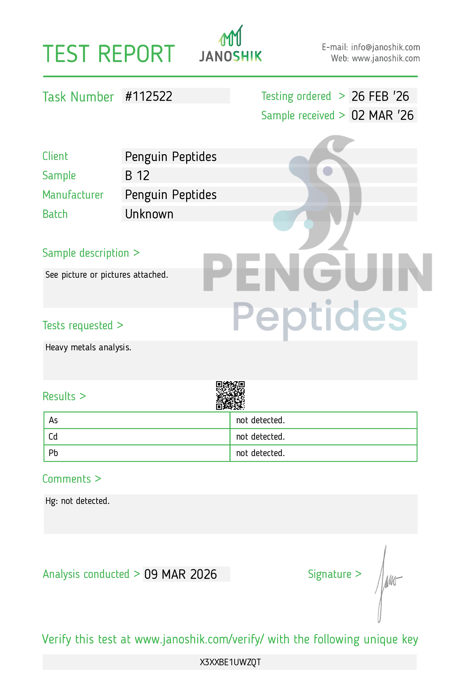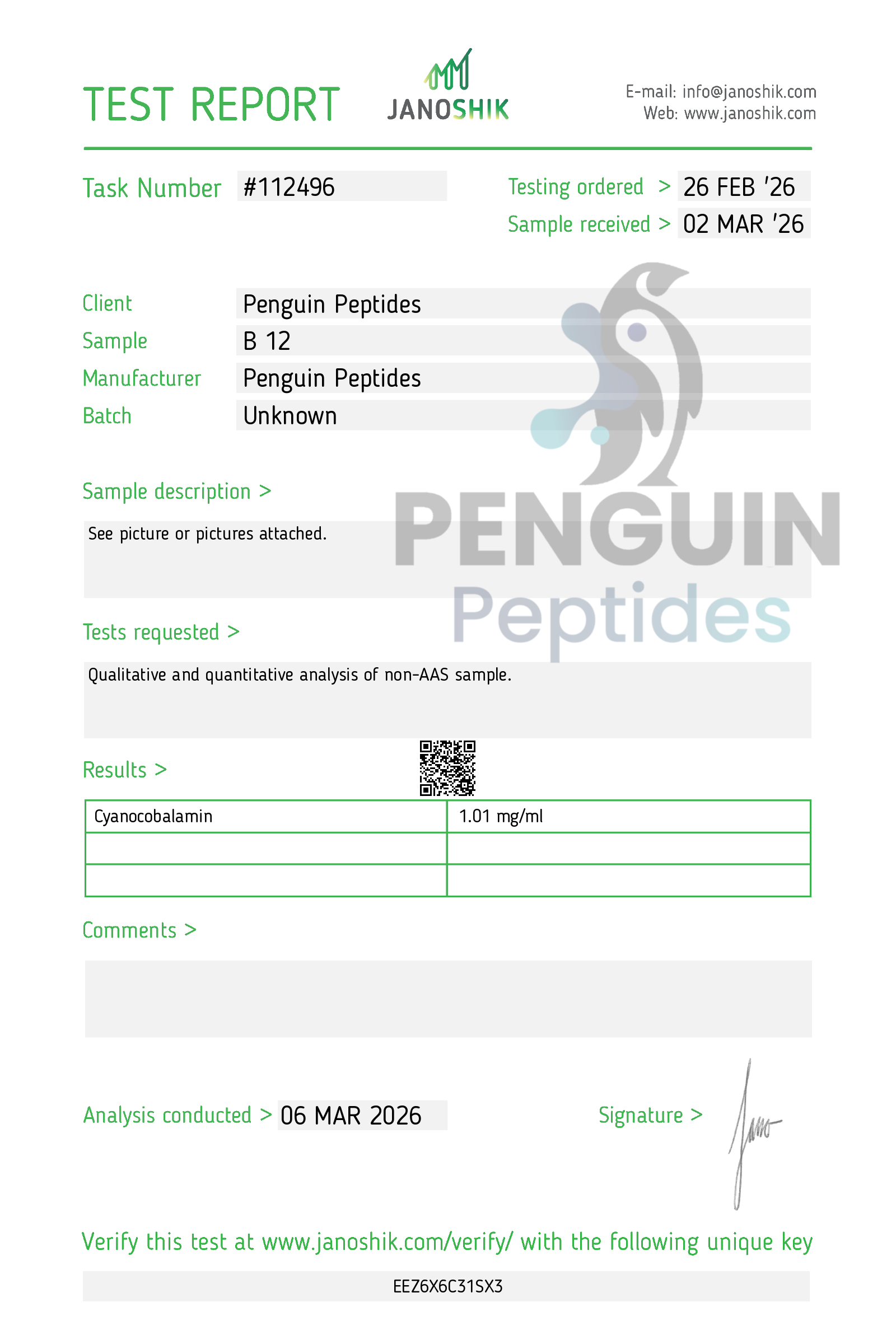 Vitamin B12 (Cyanocobalamin) is a water-soluble vitamin essential for red blood cell formation, neurological function, and DNA synthesis. In research settings, it is studied for its role in energy metabolism, nerve repair, and cognitive support.